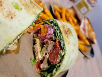 Grilled Chicken, Hummus, Spinach, Feta Cheese, Tomatoes, Pickled Red Onion, on a Pita. Served with Potatoes Chips